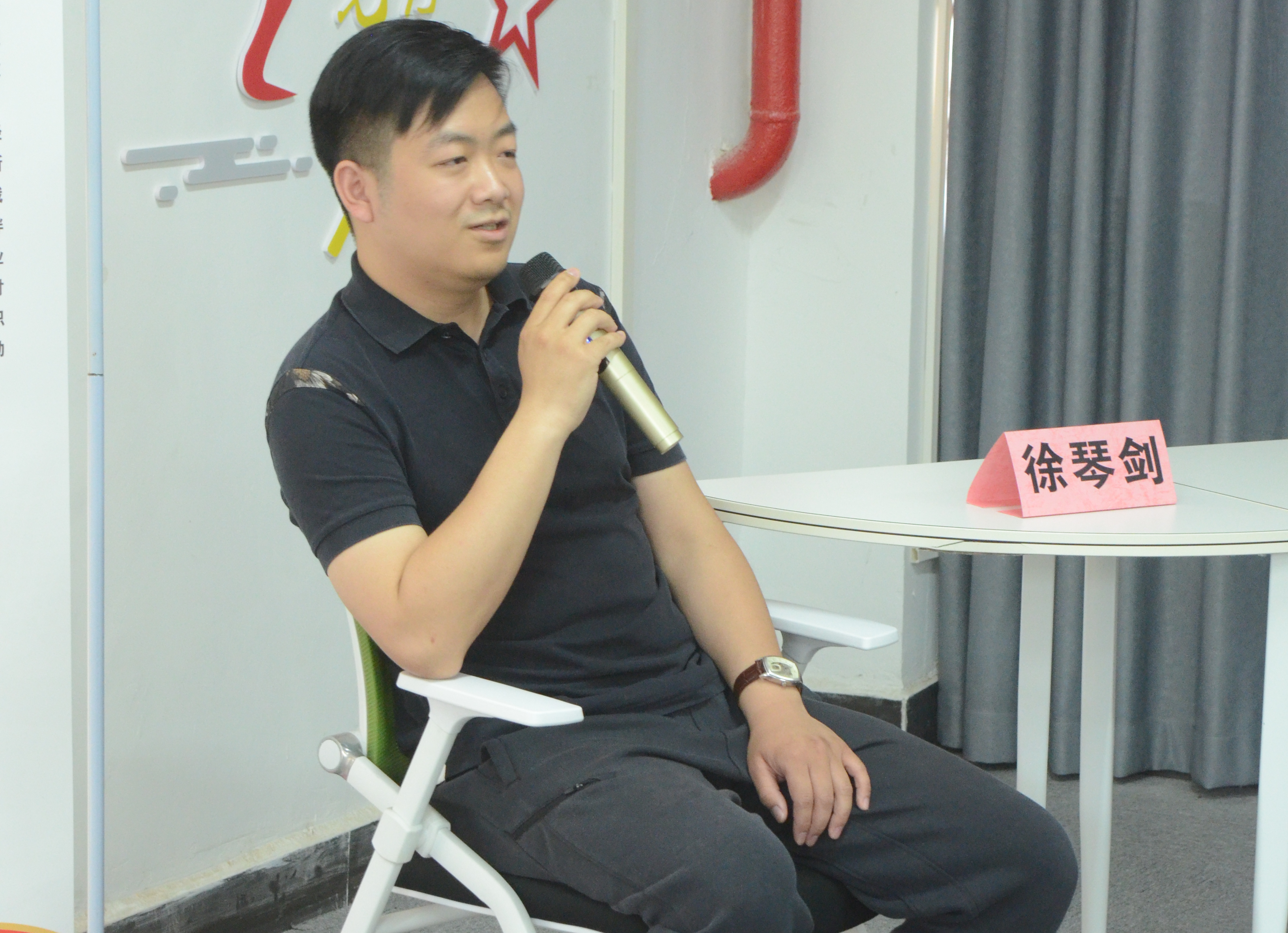 5月15日下午,公司国际经济与贸易专业2011届毕业生徐琴剑受邀回到母校参加第四十八期员工访谈活动。公司党委书记彭红波、员工工作处副处长田全喜、公司党委副书记丁升出席本次活动。访谈活动由球盟会辅导员左寅生主持。