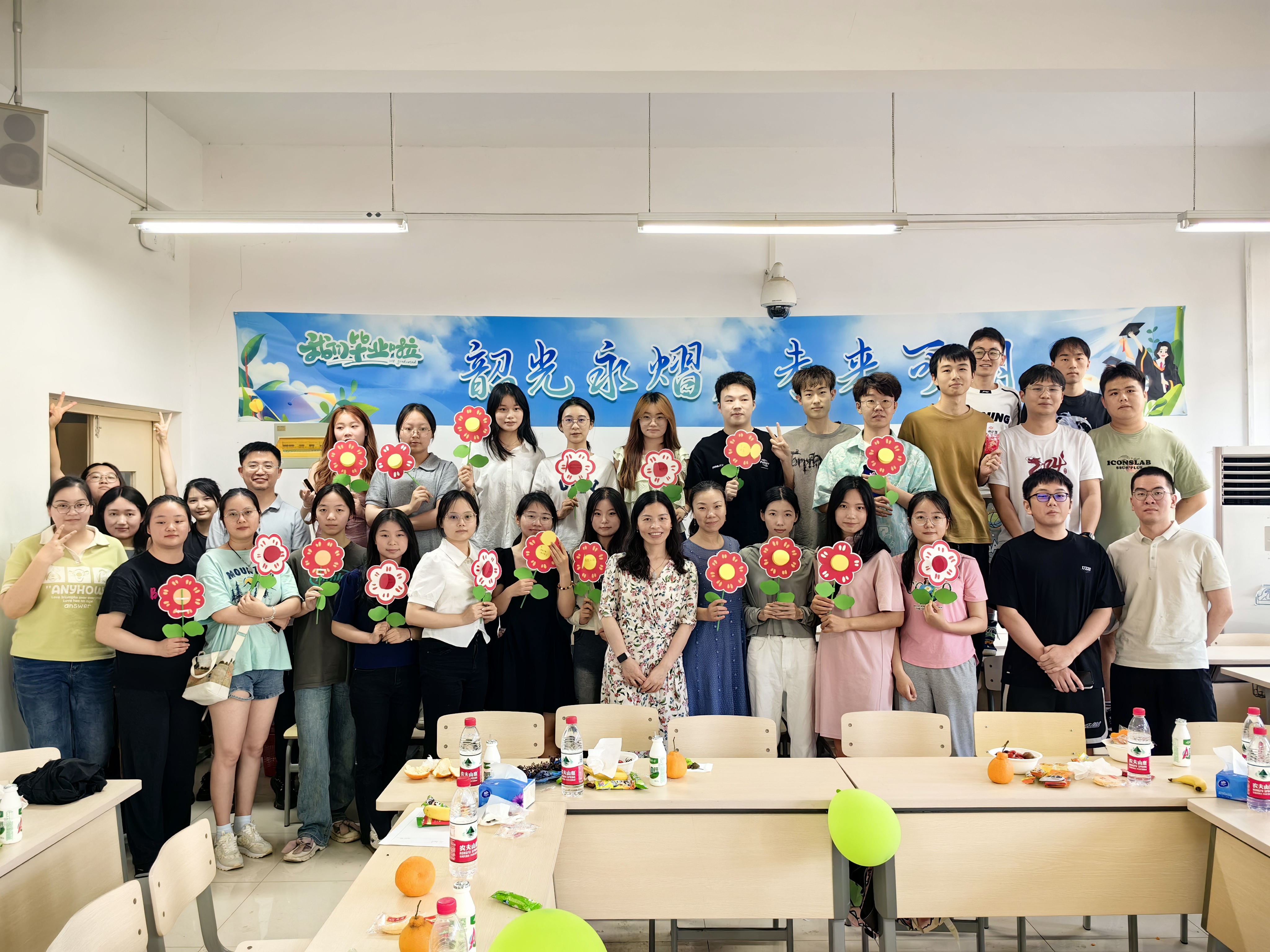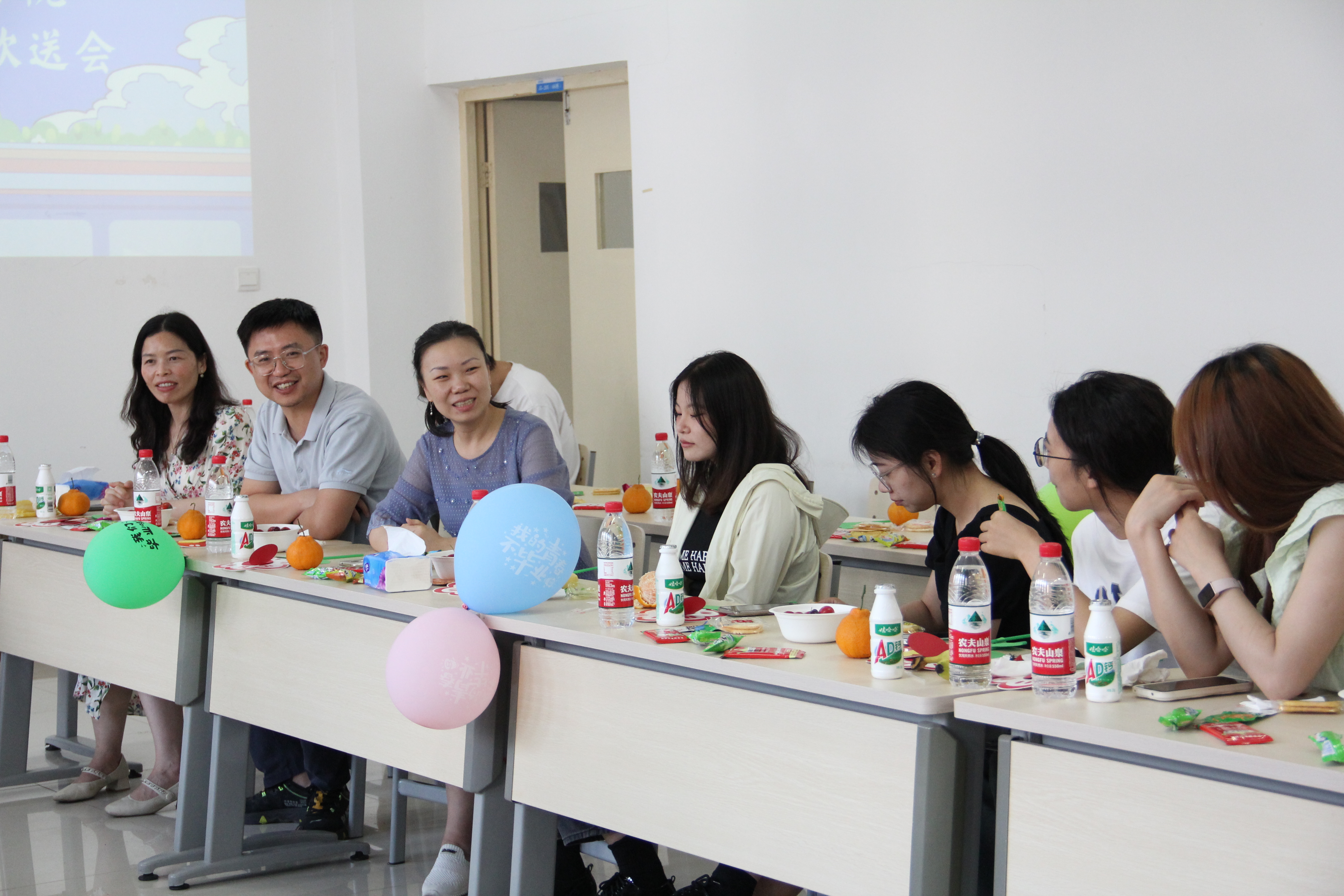 欢送会上,与会全体师生们共同观看了毕业生四年校园学习生活的温馨视频,一起回忆了老员工活的点点滴滴,师生的亲切寄语让毕业生备受鼓舞。各位毕业班班主任为同学们悉心准备了《给毕业生的一封信》,在信中各位班主任饱含深情地向同学们表达了不舍和期许。“话短情长”环节将欢送会推向高潮,全体师生通过击鼓传花的形式踊跃地分享了大学里那些美好与难忘的时刻。最后,欢送会在“同一首歌”里落下帷幕,全体师生们深情合唱《再见》《送别》等毕业经典歌曲,引得同学们感动落泪。