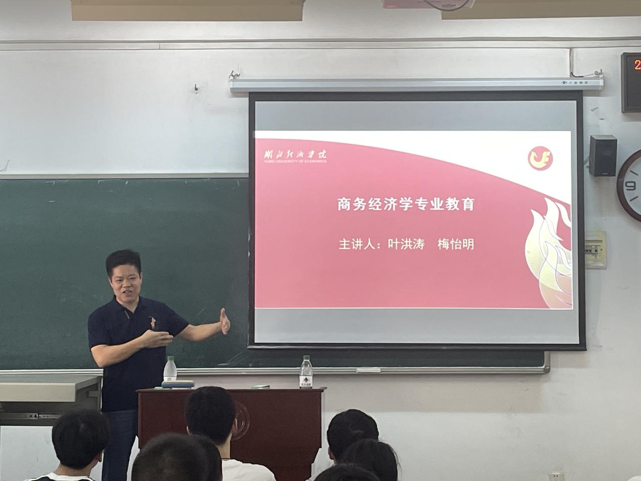 商务经济学系系主任叶洪涛老师用幽默风趣的语言讲解了本专业的学习内容及人才培养方案,并深入介绍了公司商务经济学的团队建设条件与资源。他鼓励新生们积极参与第二课堂活动,在提升学习能力的同时拓展实践本领。