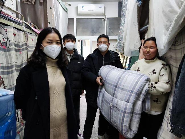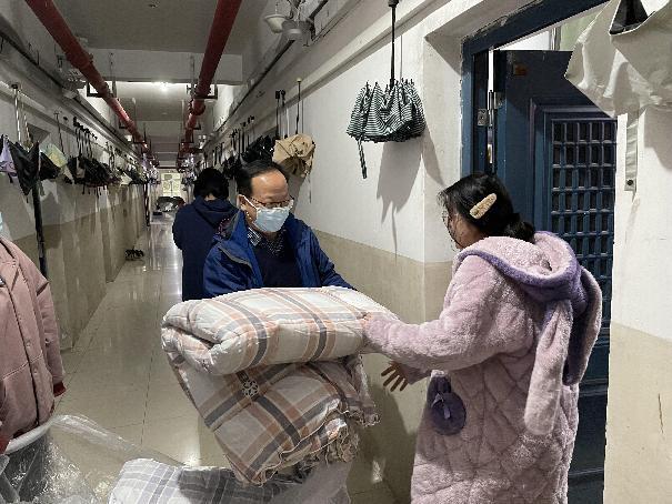 一场突如其来的疫情打破了校园原有的平静,为了切实保障员工的生命健康,面对严峻的疫情形势,公司第一时间启动应急预案,各部门严格落实各项疫情防控工作要求,力争在最短时间内打赢这场校园疫情阻击战。但是疫情无情人有情,隔绝病毒不隔绝爱,球盟会在有条不紊地部署公司疫情防控工作的同时,立即在学工处的组织下开展送温暖活动。本次活动由经贸公司党委书记聂春田、经理赵锋、党委副书记涂宇琼、副经理陶珍生、乔长涛以及公司辅导员一行9人于11月29日前往公司员工宿舍,在寒潮来临前将员工急需的棉被送到他们手中。虽然当天气温很低,还伴随着大风和降雨,但公司领导和辅导员们没有感受到丝毫的寒冷,因为他们手中传递的不仅仅是一床棉被,更是对员工沉甸甸的爱。