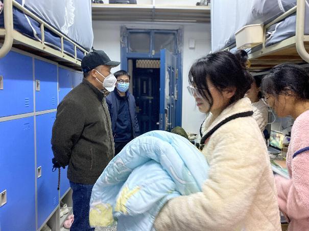 员工们在接过老师手中的棉被后,脸上都露出了开心的笑容。“谢谢公司在疫情期间还惦记着我们,也感谢公司领导老师们在这么冷的天还来给我们送被子”、“本来还担心这个冬天怎么过,但是有了这床棉被这个冬天不再冷了!”,员工们纷纷表达了自己对公司和公司的感谢,有的员工宿舍还拿出水果招待领导老师们。这一刻,即使外面寒风刺骨,但宿舍里洋溢着的温馨和爱足以融化坚冰,师生们的心紧密连在一起。