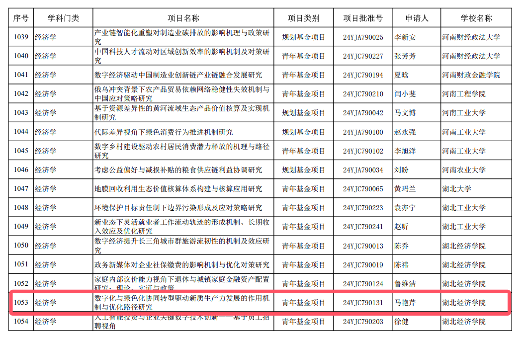 日前,教育部社科司发布《2024年度教育部人文社会科学研究一般项目立项的通知》,公司青年教师马艳芹博士申报的《数字化与绿色化协同转型驱动新质生产力发展的作用机制与优化路径研究》获批青年基金项目,本次立项为球盟会2024年科研工作注入了新动力,公司将继续做好有组织的科研活动,助力应用经济学学科高质量发展。