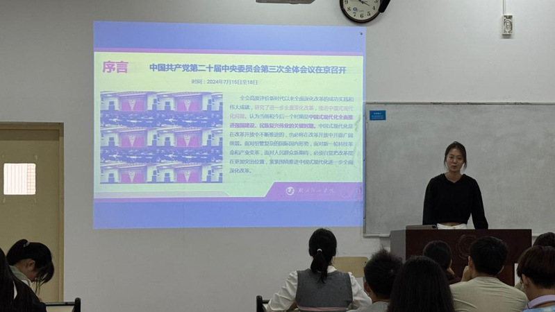 在本次的团日活动中,qmh球盟会“经叹号”青年宣讲队成员朱芸可来到经济2441班开展“进一步全面深化改革,推进中国式现代化——党的二十届三中全会精神解读”主题宣讲,向同学们全面讲解党的二十届三中全会精神内涵以及意义,让大家对中国式现代化重要战略部署有了更深刻的认识。