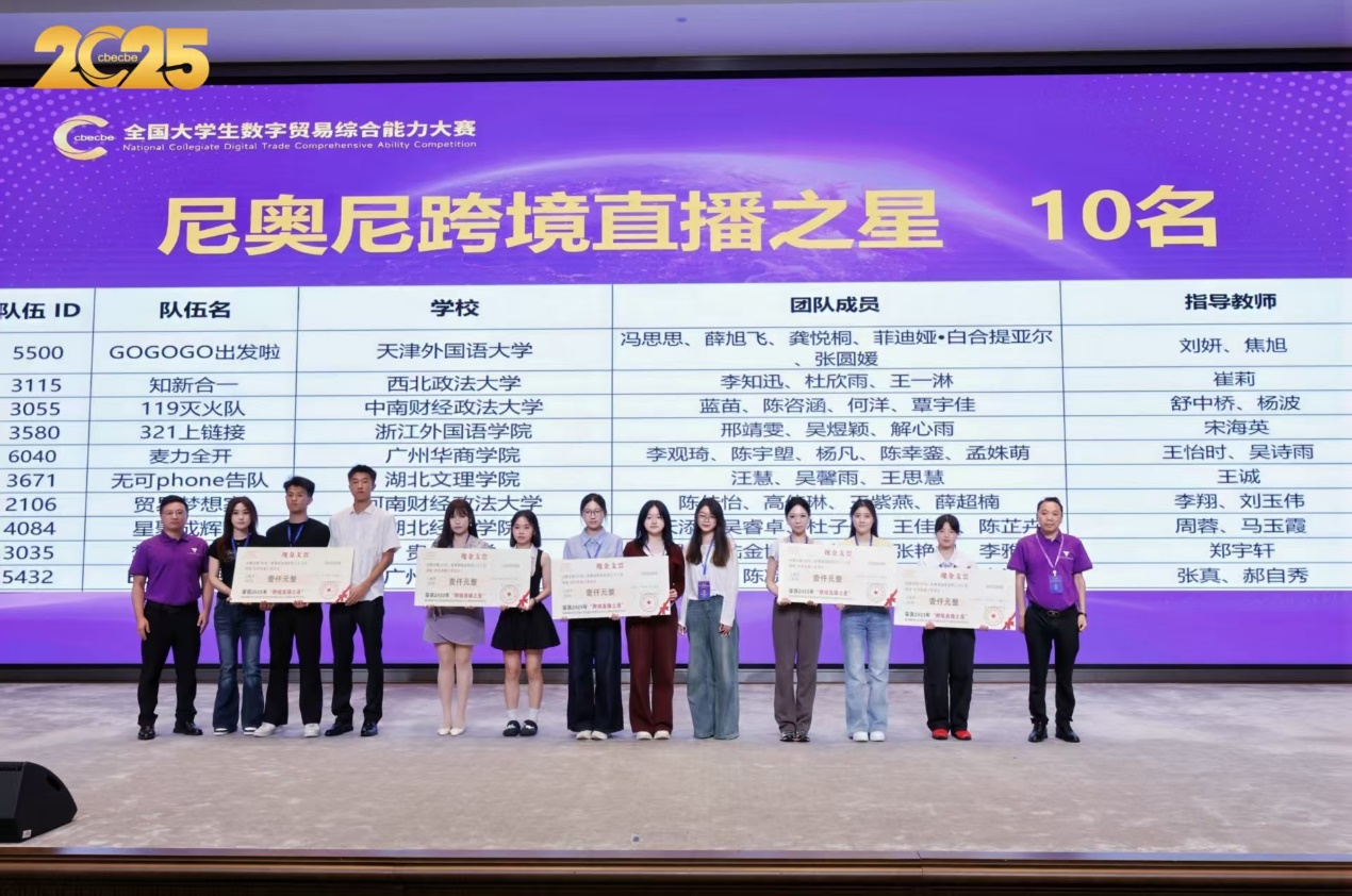 国赛现场采用10分钟现场跨境直播的高难度形式,全面考察选手的多语种表达、产品跨境适配、直播互动运营等综合能力。“星聚成辉队”依托公司“数字贸易+实战能力”的特色培养体系,以流利的外语解说、精准的市场定位和极具感染力的直播节奏,呈现了一场专业高效的跨境直播实战,最终在57支决赛队伍中脱颖而出,斩获二等奖殊荣。