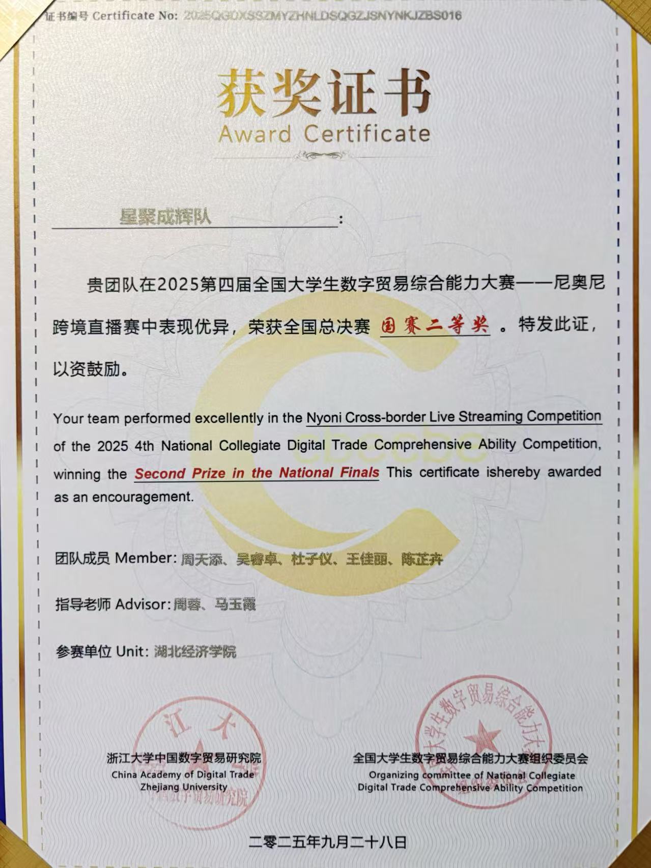 此次获奖是公司深化“以赛促学、产教融合”育人理念的生动印证。作为公司新财经改革的核心院系,公司始终以全国性高水平赛事为抓手,通过本科生导师制、跨境电商实训基地等平台,推动数字技术与贸易专业深度融合。未来,公司将继续以全国性权威赛事为纽带,深化校政企协同合作,持续培养适应数字经济时代需求的实战型人才,助力公司打造数字贸易人才培养高地。