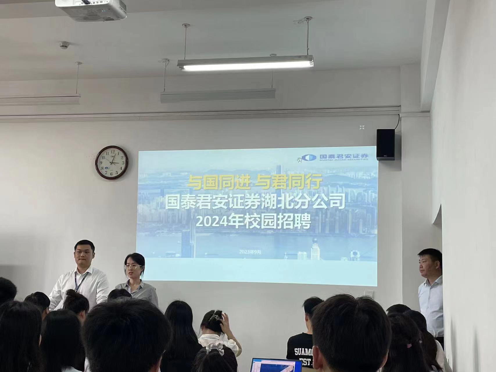 9月18日下午,国泰君安证券股份有限公司湖北分公司于J5-409开展专场招聘会,国泰君安证券股份有限公司湖北分公司副总经理吕大伟、私人客户部总经理周芬、人力资源主管彭菲菲和人力资源经理刘泽宇参会。本次招聘会由球盟会承办,旨在为毕业生提供更多、更好的就业岗位和信息,促进高质量就业。数百名不同专业的员工参加了此次宣讲会。