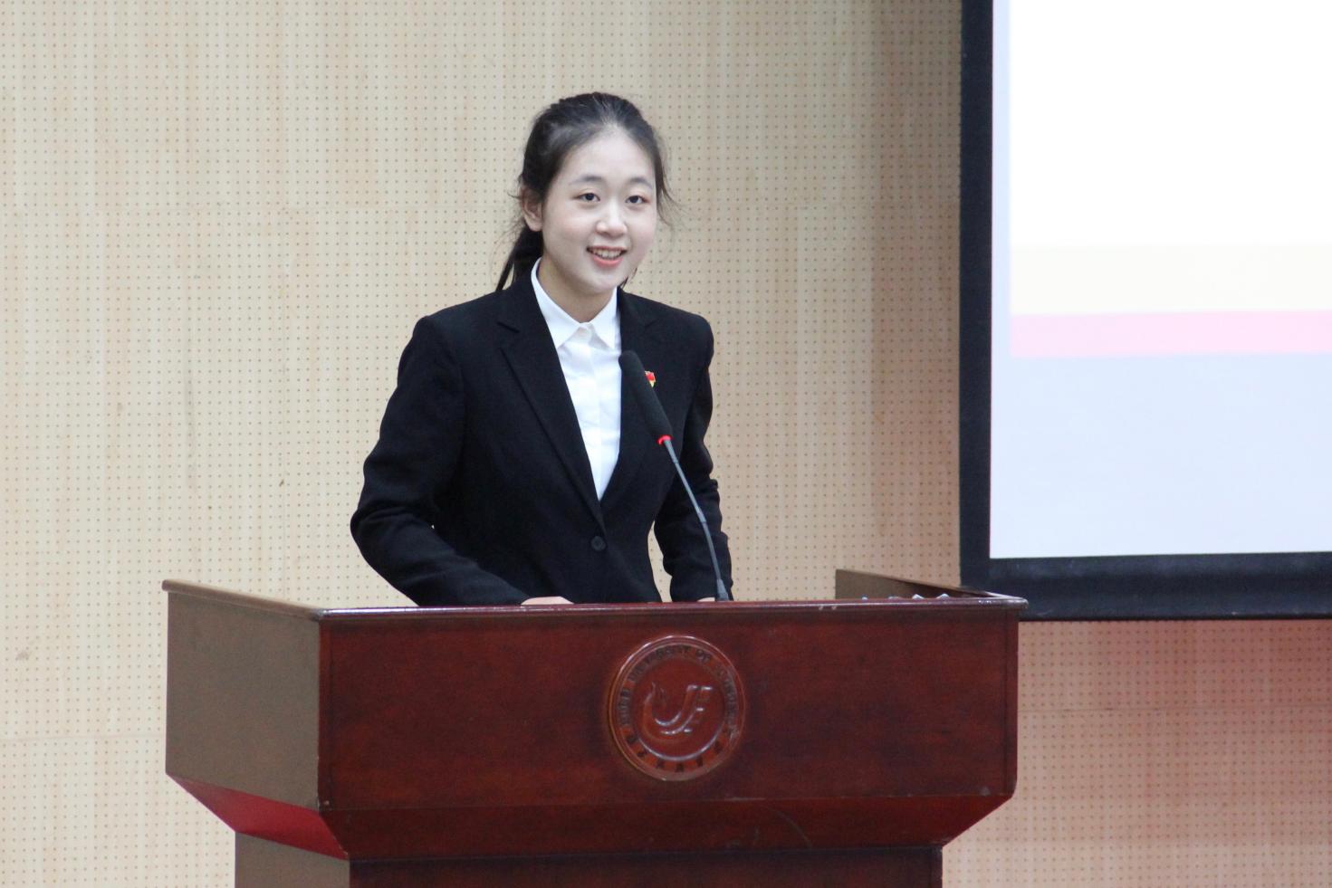 经济2142班张弛作为员工代表发言,她分享了她的大学学习成长经历,鼓励同学们去探寻多元的自我,充分挖掘自身潜力,并肩奔赴理想的远方。