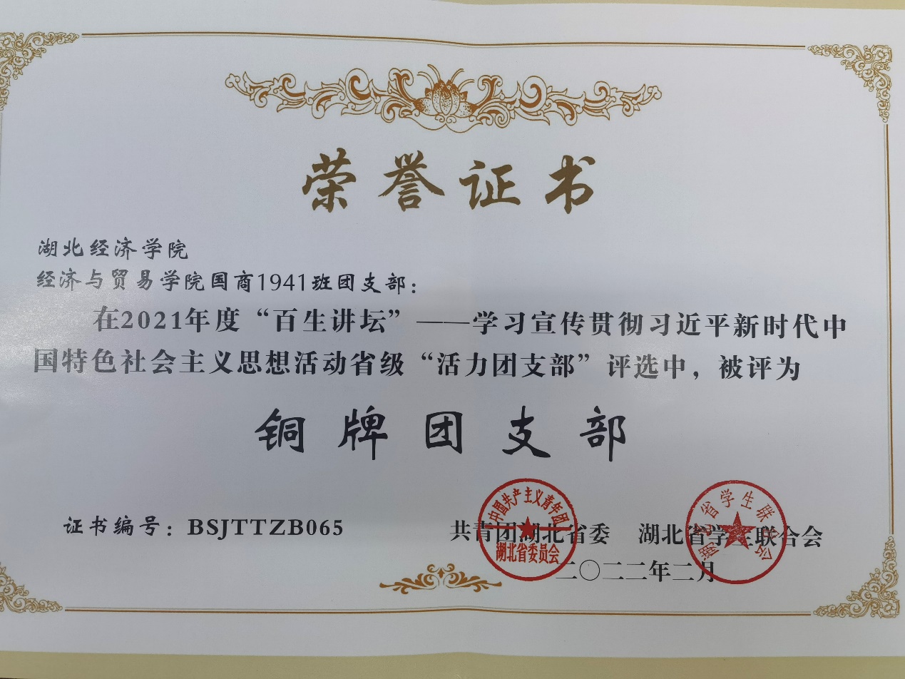 (通讯员 陈骏)2022年2月,公司国商1941团支部在湖北省2021年度“百生讲坛”——学习宣传贯彻习近平新时代中国特色社会主义思想活动省级“活力团支部”评选中,被评为省级铜牌团支部。