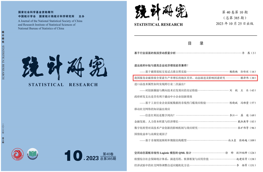 公司滕泽伟老师的研究成果“我国服务业碳排放全要素生产率增长的地区差异、动态演进及影响因素研究”在国内权威期刊《统计研究》2023年第10期正式发表。